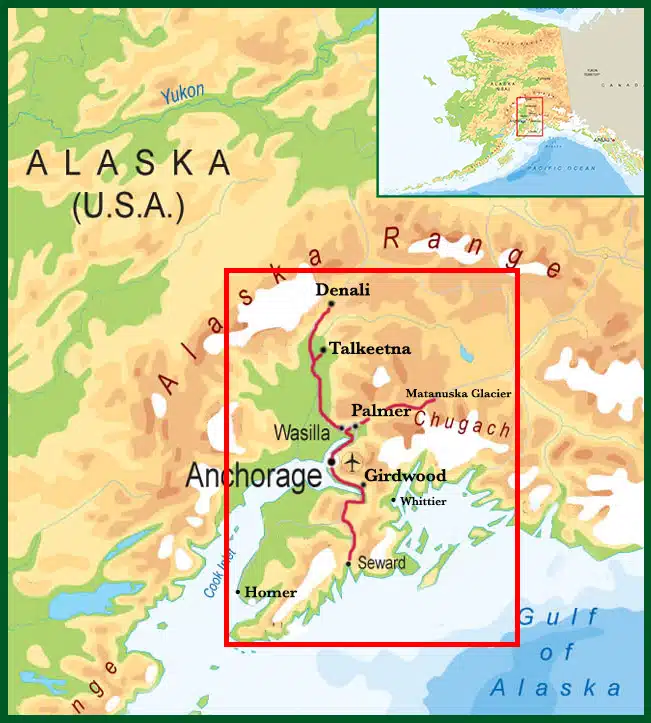 DAILY ITINERARY: Your escorted vacation is spent fully discovering Alaska and meeting Alaskans. Generally, trip days begin 8-9 am and end 8-9 pm, give or take an hour if the day warrants. Travel is at a comfortable pace, with time out of the vehicle to explore many things along the way. Custom and Optional activities can be arranged for an even more personal experience. Travelers should be able to walk unassisted (at least a block and up a few stairs), and in good medical condition in order to participate in this small group tour. Times listed are approximate and if needed ATG may alter the schedule as needed to suit the situation.