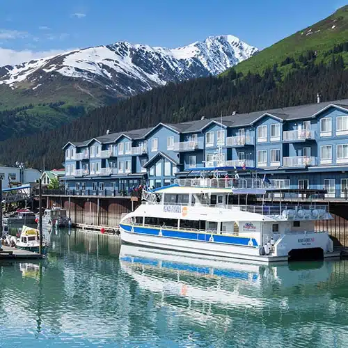 Hotel: Harbor 360 – Harbor view rooms, in the city of Seward with great views of the Boat Harbor and Resurrection Bay. Harbor View rooms with either 2 queen beds or one king. Includes continental breakfast room. Easy walking distance to shops, dining, and convenient for a walk along the bay under the late evening sun.
